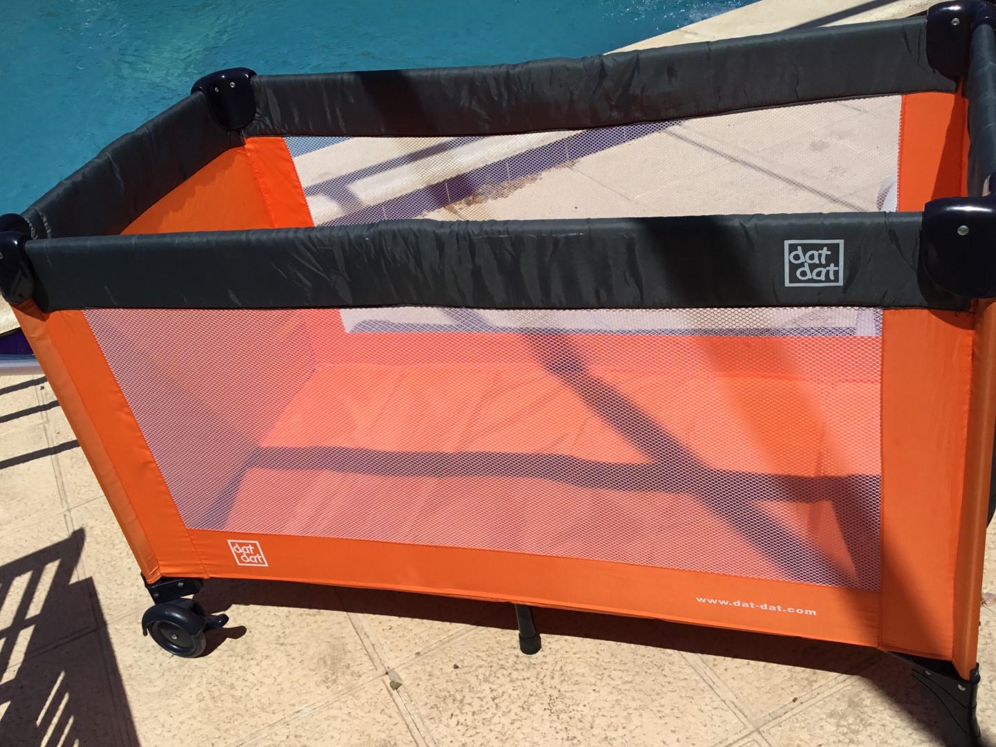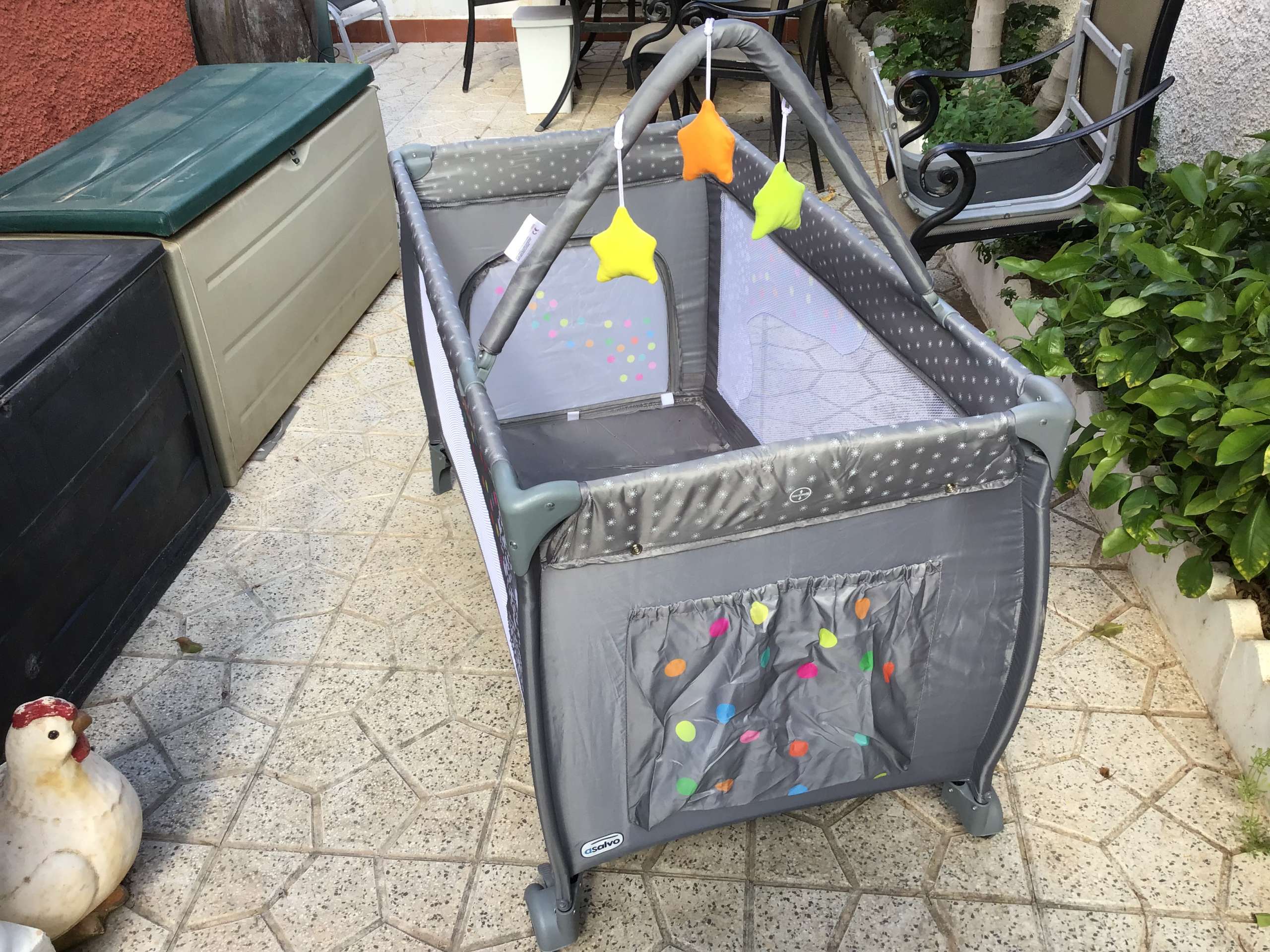 Easy to transport travel cot with it’s thin mattress add 7 euros if need fresh linen and foam mattress